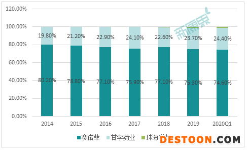 從近年市占率來(lái)看,原研份額下降明顯,國(guó)產(chǎn)替代正當(dāng)其時(shí)。公司作為國(guó)內(nèi)最先實(shí)現(xiàn)規(guī)?;a(chǎn)甘精的藥企,市占率有望持續(xù)提升。截至2020年一季度,原研藥生產(chǎn)商賽諾菲在樣本醫(yī)院的市占率為74.6%,甘李占比24.4%。