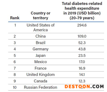 圖表3. 成年(20-79歲)糖尿病患者醫(yī)療相關(guān)支出前10名國(guó)家或地區(qū)(2019年)