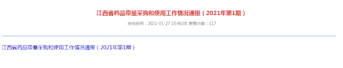 1月28日訊 1月27日,江西公布了最新的藥品帶量采購(gòu)和使用工作情況,內(nèi)容包括了截至2020年12月31日為止的三批次國(guó)家藥品帶量采購(gòu)和第一批江西省藥品帶量采購(gòu)中選結(jié)果網(wǎng)上采購(gòu)使用數(shù)據(jù)。