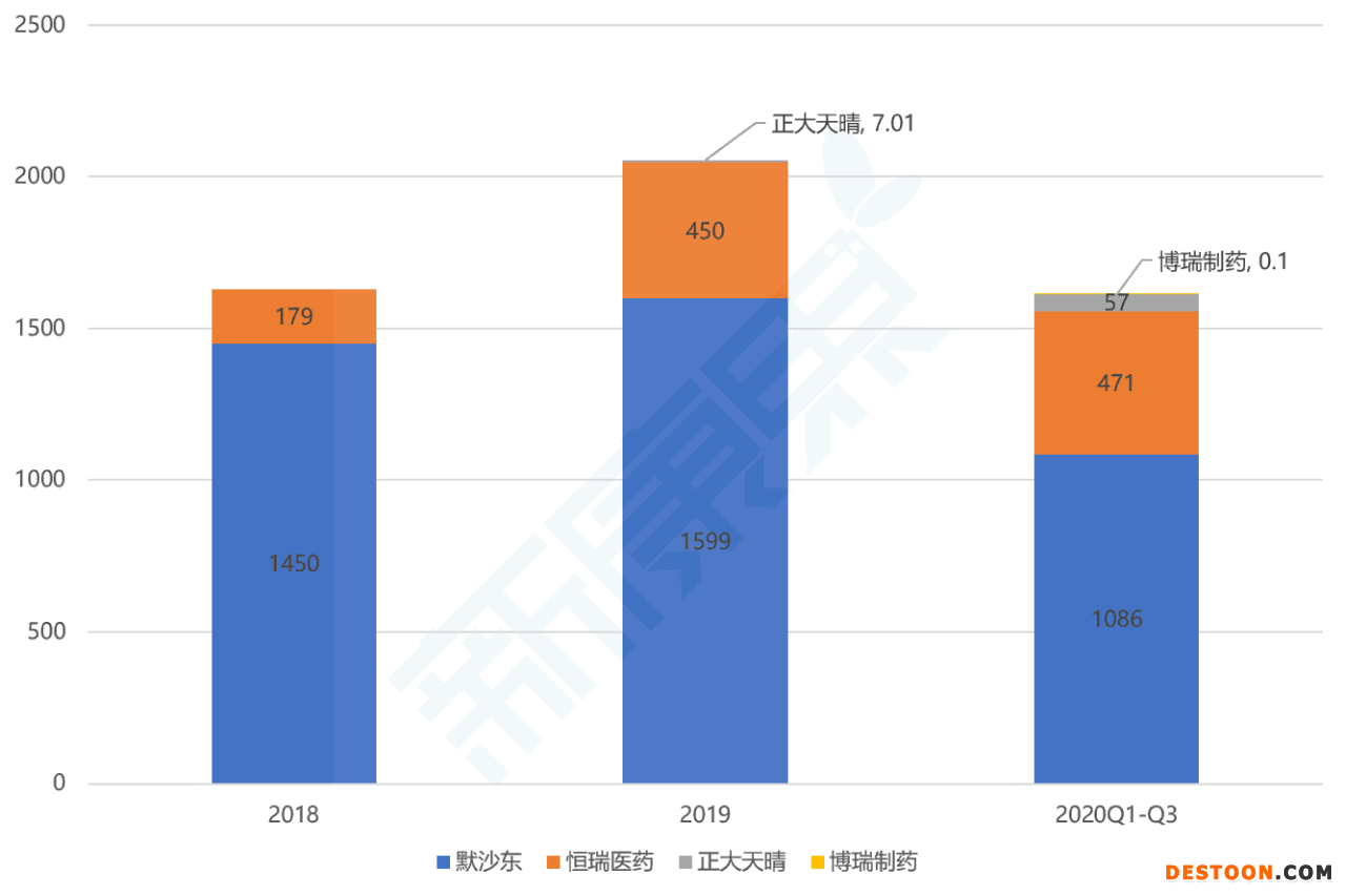 2014年,卡泊芬凈的專利到期。2017年1月,恒瑞醫(yī)藥宣布國內(nèi)首仿注射用醋酸卡泊芬凈獲批上市,公告中透露的研發(fā)投入高達3054萬元。2019年6月,正大天晴的二仿獲批上市。2020年1月和8月,博銳制藥和海思科的仿制藥產(chǎn)品分別獲批上市。截至2021年2月,注射用醋酸卡泊芬凈在國內(nèi)的仿制藥產(chǎn)品仍然只有以上4款,競爭格局比較寬松。