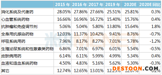 圖4:2019-2020E化學(xué)藥消化系統(tǒng)及代謝藥亞類份額及走勢(shì)