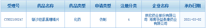 3月3日訊 3月2日,CDE官網(wǎng)顯示,辰欣藥業(yè)|海南華益泰康藥業(yè)的纈沙坦氫氯噻嗪片以仿制4類提交上市申請獲受理。米內網(wǎng)數(shù)據(jù)顯示,2019年在中國公立醫(yī)療機構終端和中國城市實體藥店終端纈沙坦氫氯噻嗪片劑合計銷售額超過10億元。
