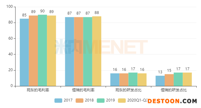 圖1:苑東生物與恒瑞醫(yī)藥的毛利率與研發(fā)投入占比情況(單位:%)