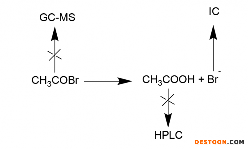 檢測物質(zhì):乙酰溴檢測難點:起初使用氣質(zhì)法對殘留試劑乙酰溴直接進行檢測,但是靈敏度不達要求??紤]到乙酰溴極易水解,水解后可以檢測生成的乙酸,即可達到定量檢測乙酰溴的目的。但是,通過嘗試我們發(fā)現(xiàn),因乙酰溴為遺傳毒性雜質(zhì),其限度很低,即使使用高端儀器仍無法解決乙酸檢測靈敏度低的問題。