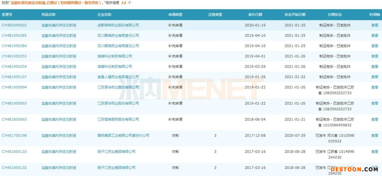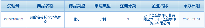 截至目前,鹽酸右美托咪定注射液已有南京正大天晴制藥、石藥銀湖制藥、江蘇正大清江制藥等8家企業(yè)以仿制3類提交上市申請在審評審批中(在藥審中心);鹽酸右美托咪定氯化鈉注射液有揚子江藥業(yè)集團、湖南科倫制藥、成都倍特藥業(yè)以仿制3類提交上市申請在審評審批中(在藥審中心)。