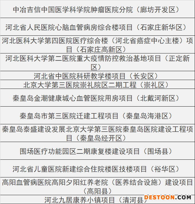 根據(jù)《河北省2021年省重點(diǎn)建設(shè)項(xiàng)目名單》,共安排省重點(diǎn)項(xiàng)目682項(xiàng),總投資11896.5億元,年度預(yù)計(jì)投資2810.6億元其中,新開(kāi)工項(xiàng)目中含醫(yī)療衛(wèi)生項(xiàng)目5項(xiàng),分別是: