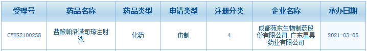 核心提示:3月10日訊 日前,CDE官網(wǎng)顯示,成都苑東生物制藥|廣東星昊藥業(yè)的鹽酸帕洛諾司瓊注射液以仿制4類報產(chǎn)獲受理,獲批后將視同過評。
