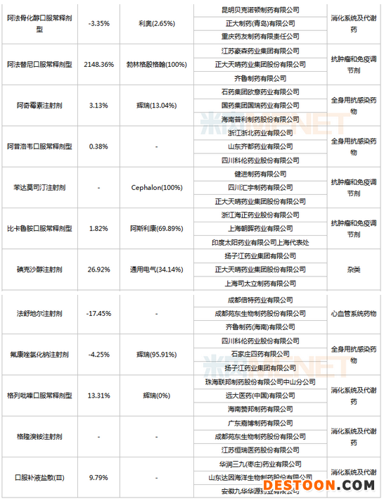 利伐沙班口服常釋劑型,拜耳市場份額100%,阿格列汀口服常釋劑型,武田市場份額100%,阿法替尼口服常釋劑型,勃林格殷格翰市場份額100%,苯達(dá)莫司丁注射劑,Cehalon市場份額100%,奧美沙坦酯氫氯噻嗪口服常釋劑型,第一三共市場份額100%,丙酚替諾福韋口服常釋劑型,吉利德市場份額100%,達(dá)比加群酯口服常釋劑型,勃林格殷格翰市場份額100%,度他雄胺口服常釋劑型,葛蘭素史克市場份額100%,舒尼替尼,輝瑞市場份額100%,西格列汀二甲雙胍口服常釋劑型,默沙東市場份額100%,西格列汀口服常釋劑型,默沙東市場份額100%,吸入用布地奈德混懸液,阿斯利康市場份額100%,吸入用異丙托溴銨溶液,勃林格殷格翰市場份額100%,莫西沙星滴眼劑,諾華市場份額100%...