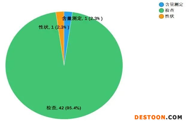 不符合規(guī)定項(xiàng)目包括性狀、檢查和含量測定,不符合規(guī)定產(chǎn)品數(shù)量依次為1、42和1批次,分別占全部不符合規(guī)定項(xiàng)目的2.3%、95.4%和2.3%(見圖6)。