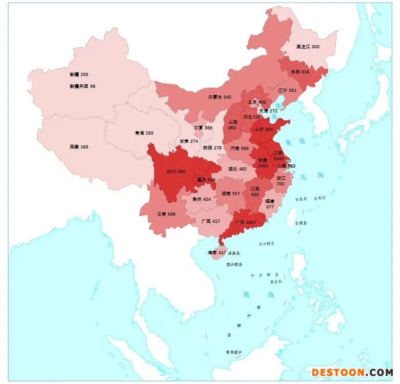 ?。ㄗⅲ簣D中數(shù)字為各省抽樣批次數(shù),顏色由淺到深分別表示抽樣批次數(shù)由低到高)