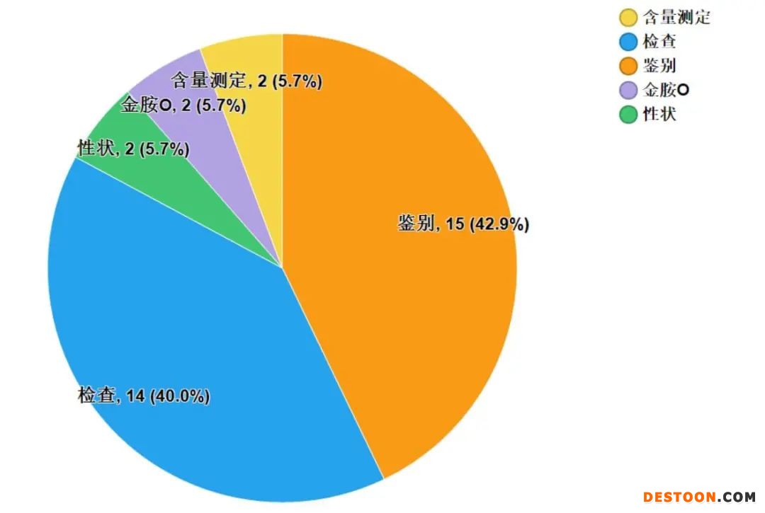 不符合規(guī)定項(xiàng)目主要涉及檢查、性狀、鑒別、含量測定等,不符合規(guī)定產(chǎn)品數(shù)量依次為14、2、15和2批次,分別占全部不符合規(guī)定項(xiàng)目的40.0%、5.7%、42.9%和5.7%(見圖8)。