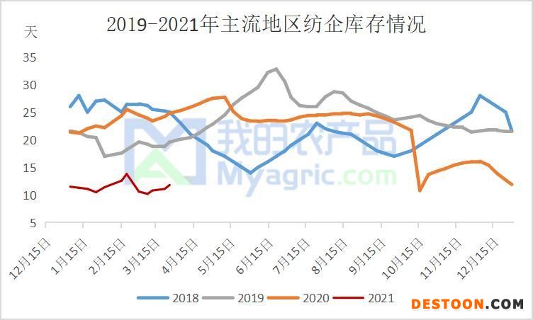 因近年市場(chǎng)價(jià)格波動(dòng)頻繁,紡企抗風(fēng)險(xiǎn)意識(shí)越來(lái)越強(qiáng),多數(shù)廠家多按單生產(chǎn),常規(guī)備貨較少,且前期貿(mào)易商囤貨意愿較強(qiáng),因此當(dāng)前紡企紗線成品庫(kù)存偏低。截止3月26日,全國(guó)主要地區(qū)紡企紗線庫(kù)存為11.8天,較上周增加0.7天,環(huán)比增加6.3%,較去年同期減少13天,同比減少52.4%。因部分紗廠后期訂單跟進(jìn)不足,部分常規(guī)品種庫(kù)存少量增加,但整體增幅不大,紗廠庫(kù)存壓力不大。