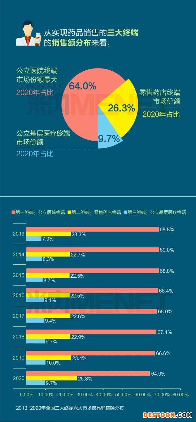 銷售額達(dá)16437億元,同比負(fù)增長8.5%。從實(shí)現(xiàn)藥品銷售的三大終端的銷售額分布來看,公立