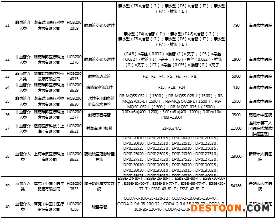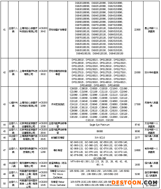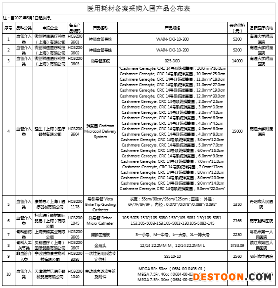 從文件中可以看到,此次共計(jì)8大類(lèi)品種,涉及71個(gè)醫(yī)用耗材入圍備案,其中包括微創(chuàng)神通醫(yī)療科技(上海)有限公司的神經(jīng)血管導(dǎo)絲、強(qiáng)生(上海)醫(yī)療器材有限公司的彈簧圈 Codman Microcoil Delivery System、北京品馳醫(yī)療設(shè)備有限公司的植入式骶神經(jīng)刺激器套件等。