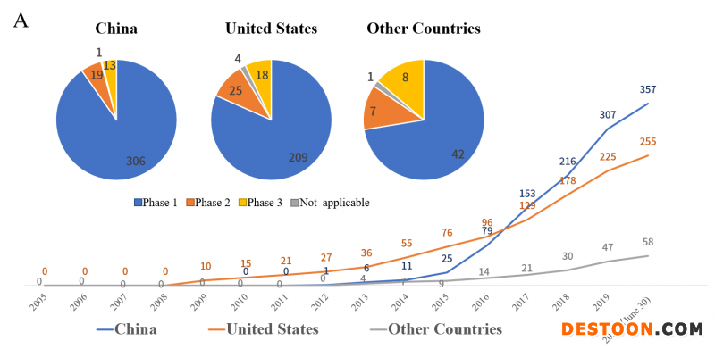 在中國的357項(xiàng)臨床試驗(yàn)中,有306項(xiàng)屬于I期研究,有19項(xiàng)屬于II期研究,有1項(xiàng)進(jìn)入了III期研究(于2020年注冊(cè));在美國的256個(gè)臨床試驗(yàn)中,I期、II期和III期試驗(yàn)的數(shù)量分別為209、25和4;在其他國家/地區(qū)的58項(xiàng)臨床試驗(yàn)中,I期、II期和III期試驗(yàn)的數(shù)量分別為42、7和1[1]。