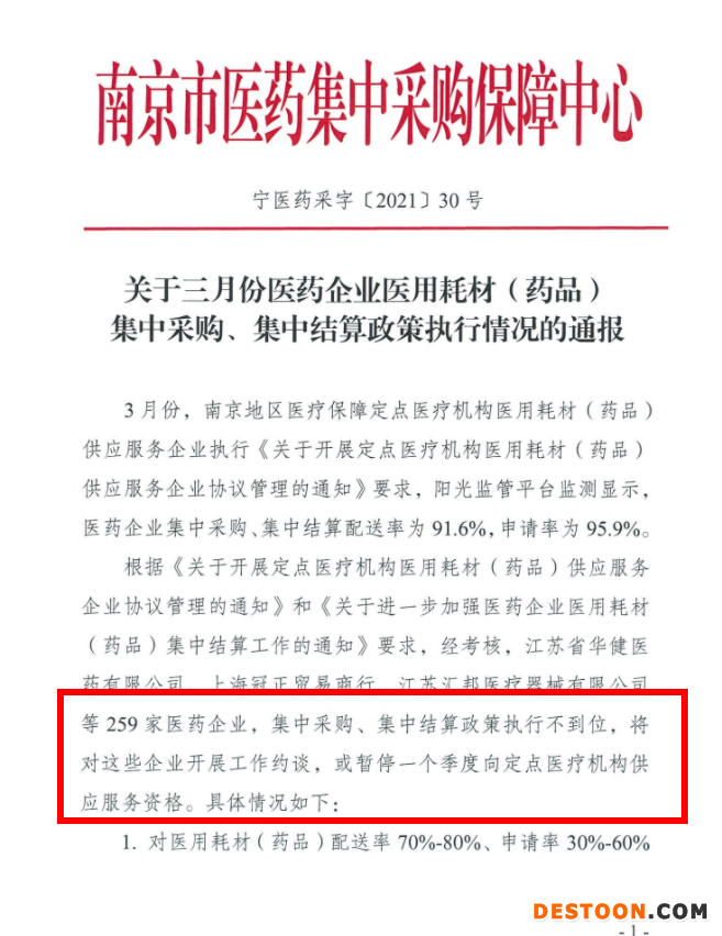 特別是最近南京市醫(yī)藥集中采購保障中心還發(fā)布了《關(guān)于三月份醫(yī)藥企業(yè)醫(yī)用耗材(藥品)集中采購、集中結(jié)算政策執(zhí)行情況的通報(bào)》,對(duì)集中采購、集中結(jié)算政策執(zhí)行不到位的259家醫(yī)藥企業(yè)進(jìn)行約談工作。