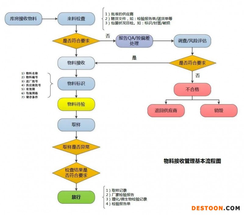 物料接收包括物料從入庫到存放、取樣、檢驗(yàn)、放行的全過程, 著重說明物料接收的步驟、檢查內(nèi)容和注意事項。