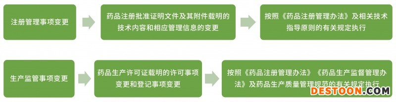 藥品上市后變更包括注冊管理事項(xiàng)變更和生產(chǎn)監(jiān)管事項(xiàng)變更,也就是涉及注冊批件和生產(chǎn)許可證相關(guān)事項(xiàng)的變更。依據(jù)變更對藥品安全性、有效性和質(zhì)量可控性的風(fēng)險(xiǎn)和產(chǎn)生影響的程度,將變更劃分為審評類變更,備案類變更和報(bào)告類變更。