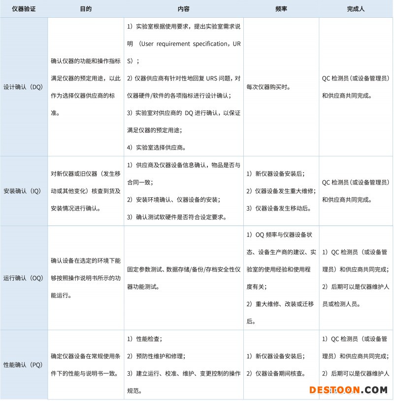 儀器運行之前的一系列工作可稱之為“儀確證”[2],由GMP規(guī)范和《檢測和校準實驗室能力認可準則》可知,“儀器確證”工作是檢測實驗室質(zhì)量保證的重要途徑,需QC相關(guān)人員配合完成對應(yīng)的實驗和文件。儀器確證是實驗室對儀器進行的生命周期全過程管理,通常用4Q確認的方式來體現(xiàn),即DQ、IQ、OQ、PQ,具體內(nèi)容見表2。